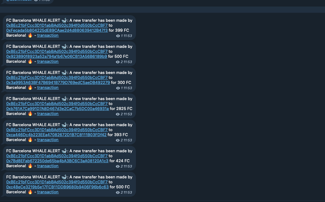 With a bit of configuration and code, you can set up a Telegram bot to notify a group whenever a Fan Token™ transfer surpasses a certain threshold.