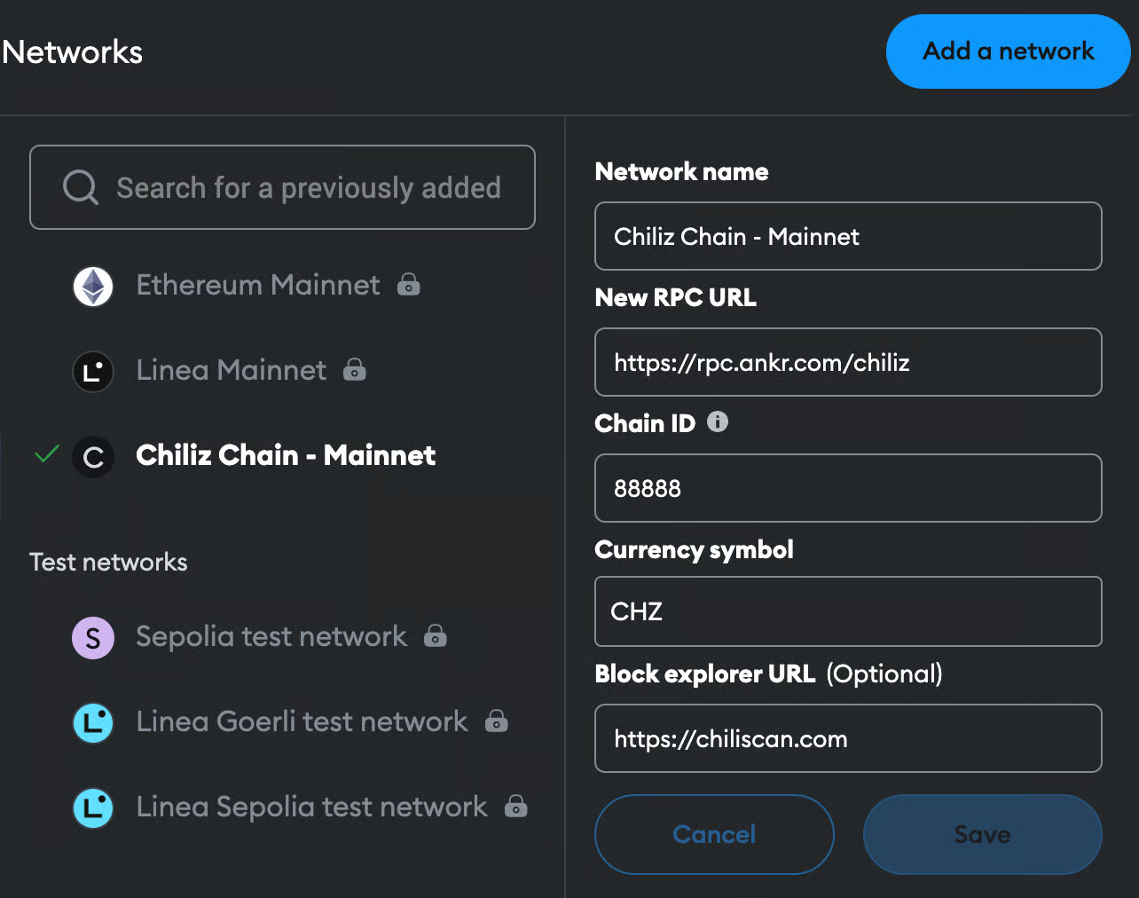 Sur la page "Add network", cliquez sur "Add a network manually", et utilisez le formulaire pour entrer les valeurs pertinentes dans les champs respectifs de votre compte MetaMask. Les valeurs pour le Mainnet de Chiliz Chain et le Testnet Spicy de Chiliz Chain sont disponibles ici.