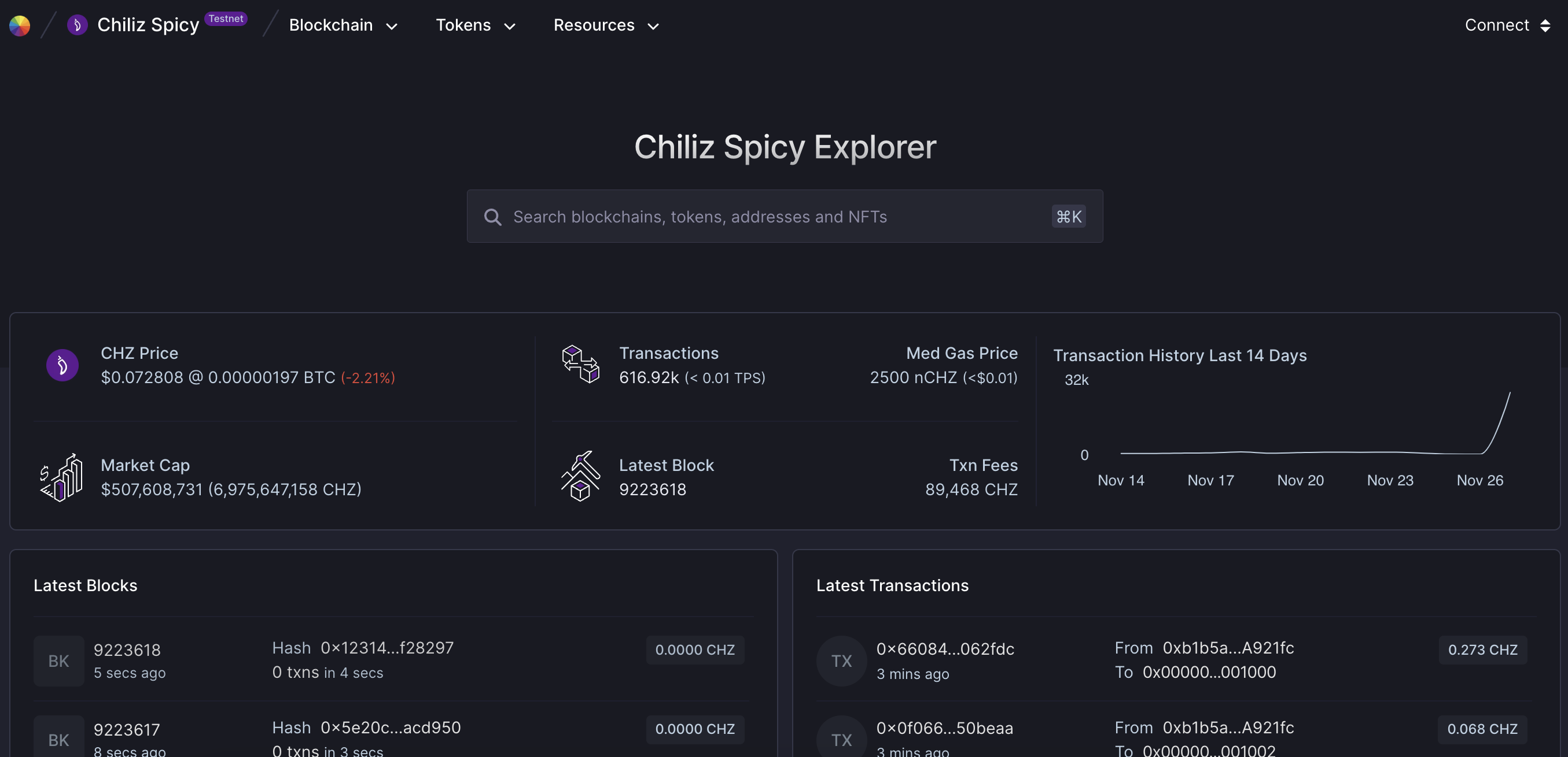 Chiliz Chain dispose de deux explorateurs de blocs pour son Testnet Spicy, que vous pouvez utiliser pour voir les transactions récentes. Vous pouvez également les utiliser pour visualiser vos propres transactions et statuts, afficher vos NFT collectés depuis le Testnet, rechercher d'autres adresses, et consulter l'historique des transactions.&#x20;