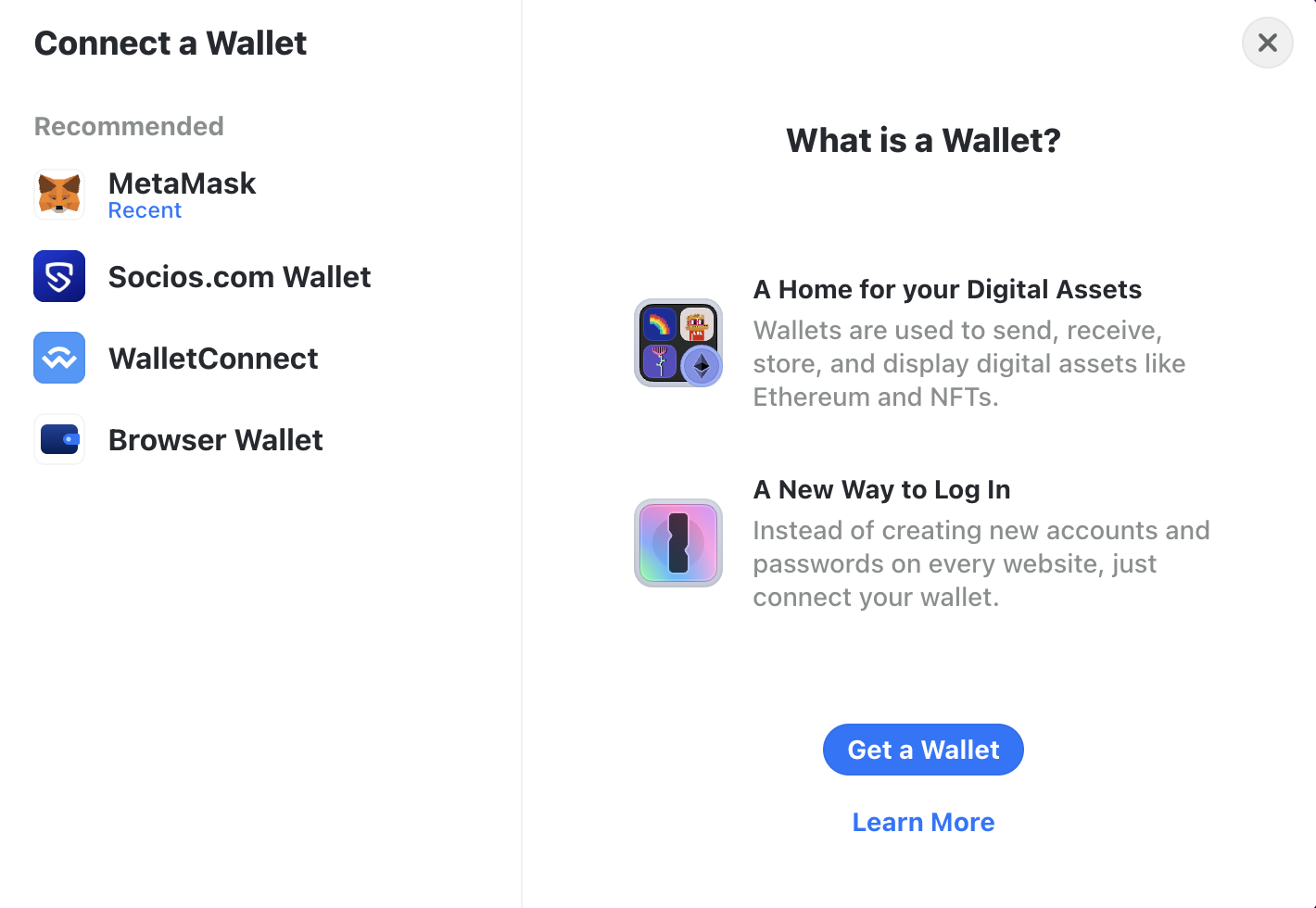 2. Click "Connect Wallet", and select your Web3 wallet of choice (for instance, MetaMask).