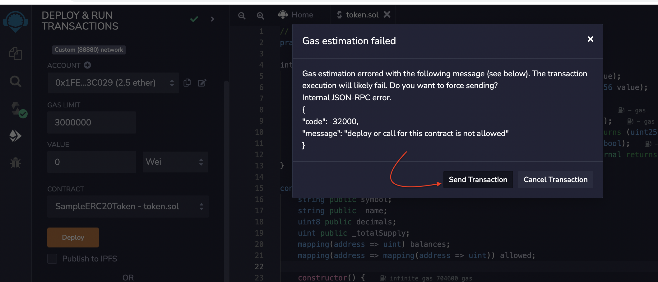 9. Retorne ao Remix IDE e selecione Send Transaction quando a janela pop-up aparecer.