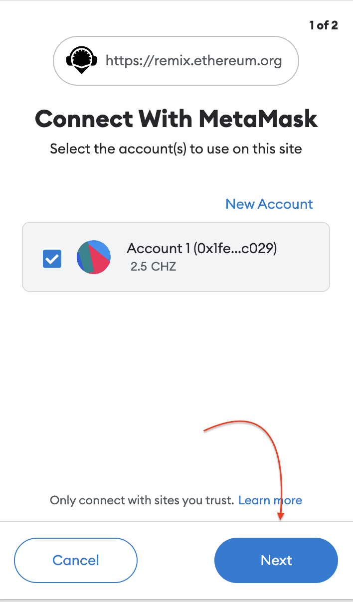 7. Selecione "Injected Provider - MetaMask" no ambiente para vincular sua conta MetaMask. Sua carteira MetaMask deve abrir automaticamente. Selecione a caixa de seleção para conectar o contrato implantado com o MetaMask. Clique em Next.