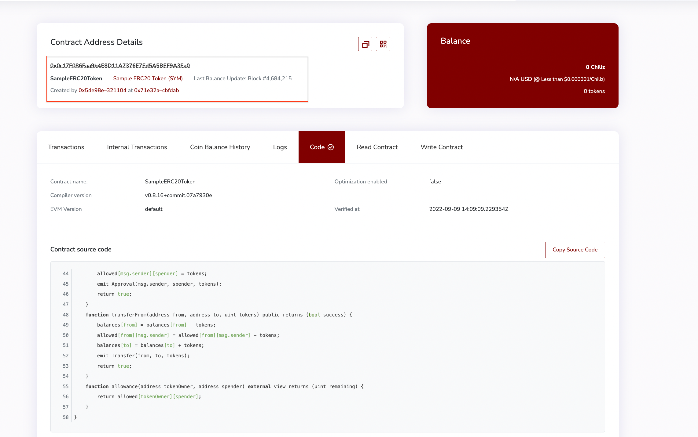 Uma vez que o código é implantado, você pode ver a transação em detalhes no Chiliz Block Explorer.